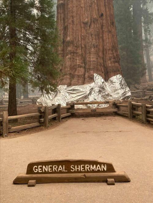 由于火灾正在威胁着红杉树国家公园和国王峡谷国家公园中的树木,为了保护树木,护林员在包括雪曼将军树在内的珍贵树木的根部覆盖了一层隔热铝箔毯。