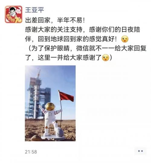 17日晚,王亚平发了凯旋后的第一条朋友圈: