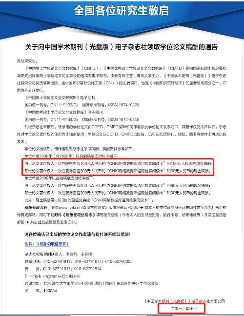 笔者发现,早在2016年10月,知网就在其官网上发布了致全国各位研究生领取学位论文稿酬的通知。