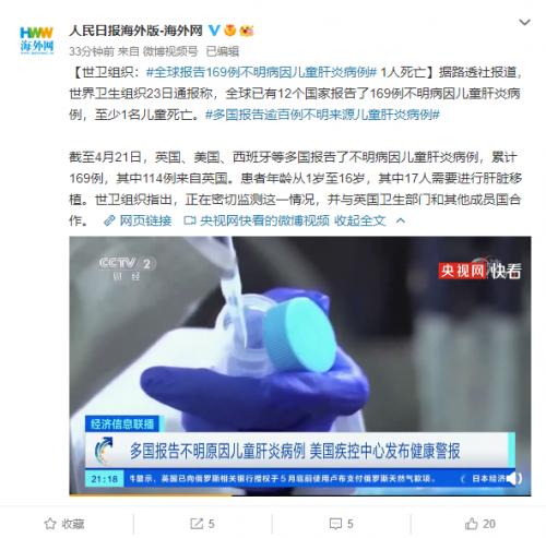 据人民日报海外版,世界卫生组织23日通报称,全球已有12个国家报告了169例不明病因儿童肝炎病例,至少1名儿童死亡。