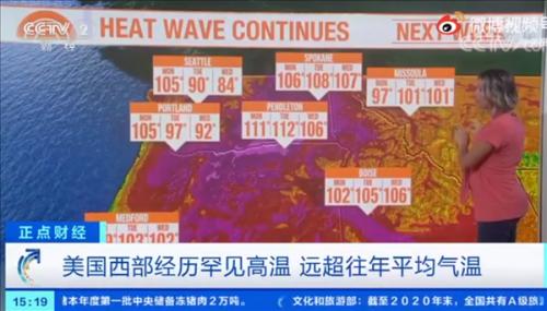据央视报道,从气象地图来看,美国西部地区20年来首次几乎被橙色预警完全覆?。往年平均气温21.1℃的西雅图,气温频频超过40℃。