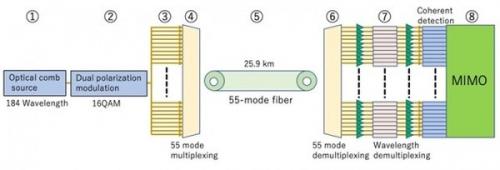 这标志着使用55种模式进行传输的首次演示,使工程师们能够比他们在今年5月创造的上一个记录更有效地利用光。该团队设法以1.02 Pbit/s的速度传输数据,只使用了四个独立玻璃芯的形式的四种模式。然后,传输带宽被分散在三个波段的801个波长通道上,现在,带宽被限制在一个波段内仅有184个波长,标志着效率有了三倍的提高。该团队表示,通过扩大频段,传输能力甚至仍有改进的余地。这项研究在9月举行的欧洲光通信会议上发表。