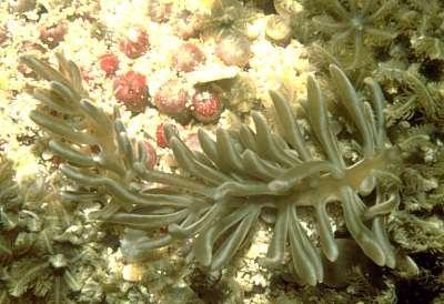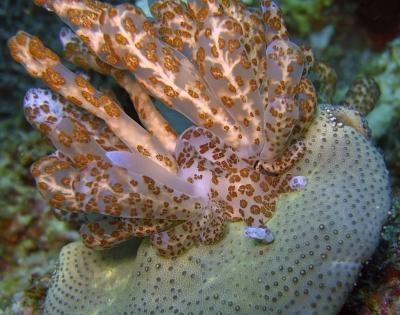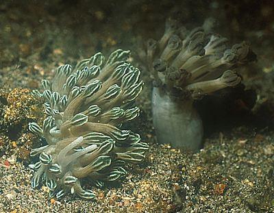 啃食笙珊瑚(Tubipora musica)的科立曼灰翼海蛞蝓Phyllodesmium colemani,可以看到只有嘴部接触了右侧的海葵丛