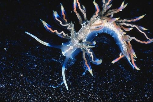 迷幻灰翼海蛞蝓”Phyllodesmium acanthorhinum可能是以柳珊瑚Acabaria为食,它体色透明,露鳃中的橙红色消化腺颜色清晰明亮,搭配金属蓝的底色和亮白色细点,十分有科幻感。其中,它储存刺细胞的刺丝胞囊就是每条露鳃顶部的黄白色区域。