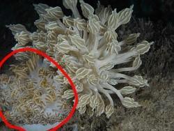 是的,红圈中的动物不是海葵,而是两只海蛞蝓。它们的身体表面长满了长长的突起和褐色的条纹,与海葵在形状和颜色上十分相似,连触手结构都模仿得惟妙惟肖,这让它们看起来就像是海葵一样,非常难以被发现。