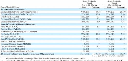 IPO前,The Column Group持股为34.4%,Casdin Group持股为10%,SymBiosis II, LLC持股为7.3%,FMR、RTW分别持股为5.9%。