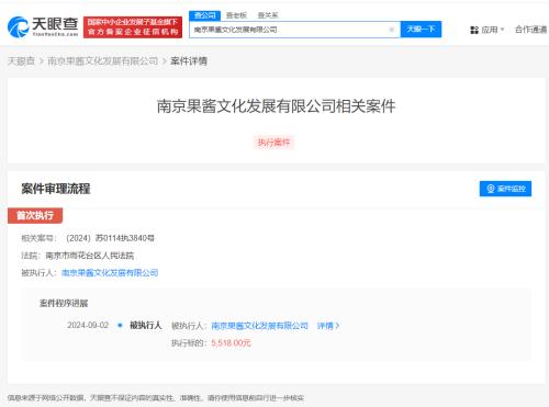 天眼查法律诉讼信息显示,9月2日,南京果酱文化发展有限公司新增一则被执行人信息,执行标的5518元,执行法院为南京市雨花台区人民法院。