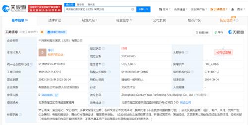 天眼查App显示,近日,中鸿世纪雅乐演艺(北京)有限公司经营状态由存续变更为注销。今年7月,该公司已发布注销备案公告,注销原因为决议解散。
