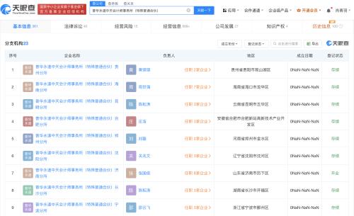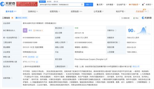 天眼查App显示,普华永道中天会计师事务所(特殊普通合伙)成立于2013年1月,执行事务合伙人为李丹,出资额约1.22亿人民币,经营范围含注册会计师业务、税务服务、财务咨询等。分支机构信息显示,普华永道中天会计师事务所拥有23家分支机构,均为其分布在贵州、昆明、宁波、厦门等地的分所。其中,普华永道中天会计师事务所(特殊普通合伙)广州分所成立于2013年4月,负责人为王斌。