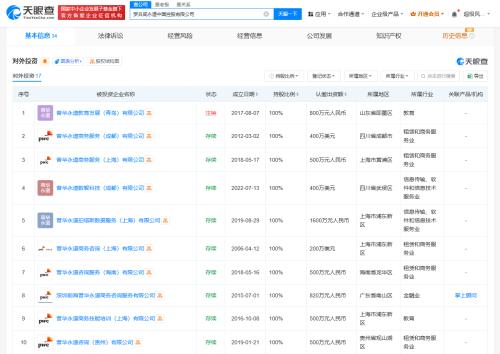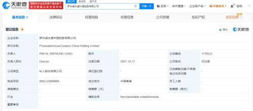 此外,罗兵咸永道中国控股有限公司注册于2007年10月。对外投资信息显示,该公司直接持有15家存续企业股份,包括普华永道商务咨询(上海)有限公司、普华永道商务服务(成都)有限公司等。