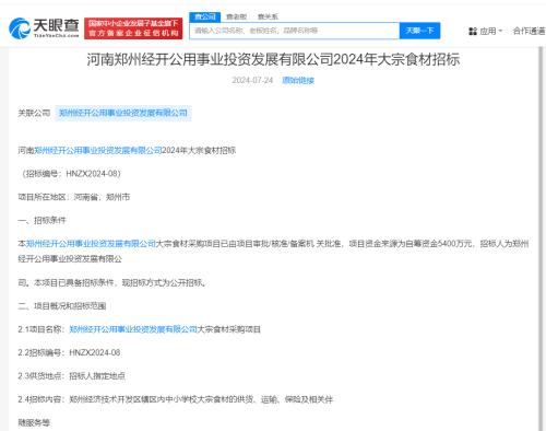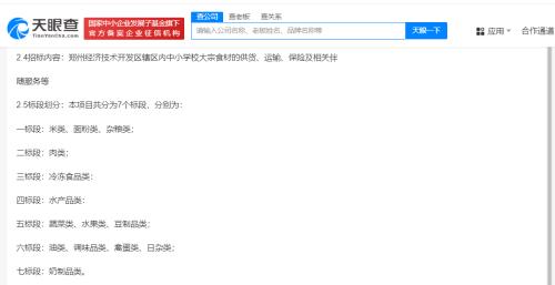 天眼查App显示,郑州美布商贸有限公司成立于2023年5月,注册资本100万人民币,法定代表人为李武,经营范围包括食用农产品批发、食用农产品零售、水产品零售、新鲜水果零售、新鲜蔬菜零售等,由李武全资持股。2023年年报信息显示,该公司参保人数为0。招投标信息显示,今年8月,该公司刚中标郑州经开公用事业投资发展有限公司大宗食材采购项目,为三标段冷冻食品类中标人,项目内容包括郑州经济技术开发区辖区内中小学校大宗食材的供货、运输、保险及相关伴随服务等。
