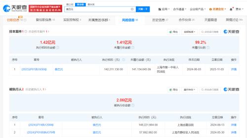 天眼风险信息显示,袁巴元现存2条被执行人信息,被执行总金额超2亿元。此外,袁巴元名下还关联终本案件信息,未履行金额超1.4亿元。