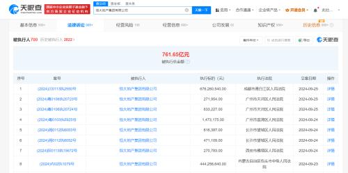 天眼风险信息显示,恒大地产集团有限公司现存700条被执行人信息,被执行总金额超761亿元。此外,该公司还存在多条限制消费令、失信被执行人(老赖)及终本案件信息。
