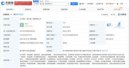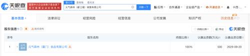 天眼查App显示,近日,元气森林(都江堰)销售有限公司成立,法定代表人为范军,注册资本500万人民币,经营范围含食品销售、酒类经营、食品互联网销售等。股东信息显示,该公司由元气森林(厦门)食品有限公司全资持股。