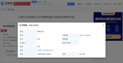 天眼查法律诉讼信息显示,近日,王鹤棣与星文图书关联公司天津星文文化传播有限公司相关肖像权纠纷案件新增开庭公告,原告为王鹤棣,该案将于10月18日在天津市武清区人民法院开庭审理。