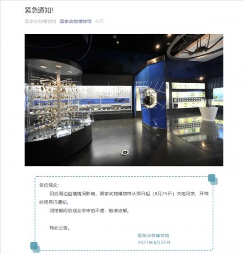 8月25日,国家动物博物馆发布紧急通知称,因受周边疫情情况影响,国家动物博物馆从即日起(8月25日)决定闭馆,开馆时间另行通知。