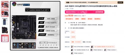 且天猫商城同样有华硕B550重炮手WIFI二代主板搭R5 5600G处理器套包,晚8点限时折后价1552.7元。