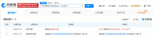 天眼查App显示,该理发店关联店铺怀化市鹤城区甘晓华美业店(个体工商户)成立于2018年7月,经营者为杨春松,经营范围为美发服务。变更记录显示,今年3月,该店铺由鹤城区杨静理发店更名为前者。