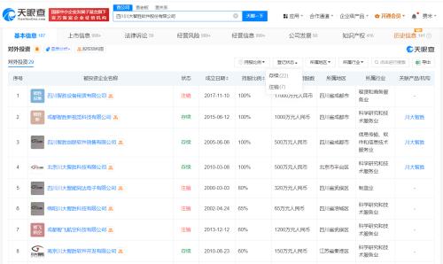天眼查App显示,四川川大智胜软件股份有限公司成立于1994年6月,法定代表人为游志胜,注册资本约2.26亿人民币,经营范围含软件开发、人工智能公共服务平台技术咨询服务、信息系统集成服务等,由游志胜、四川智胜视科航空航天技术有限公司等共同持股。对外投资信息显示,该公司持有29家企业股份,其中22家为存续状态。
