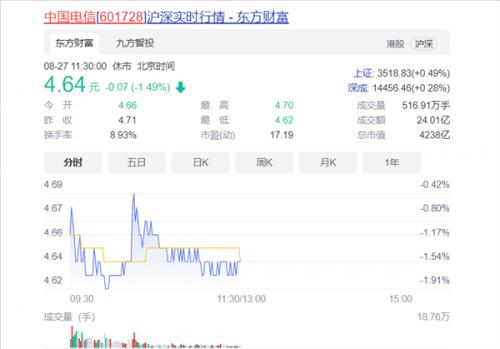 8月25日,中国电信A股平开,开盘价4.95元,随后在5.14-4.77元之间来回震荡。截至收盘,中国电信报收4.83元,微跌2.42%,市值4411亿。