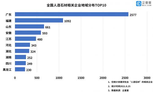 企查查数据显示,广东省是拥有“人造石材”相关企业最多的省份,共2577家,也是唯一一个存量在2000家以上的省份。福建省、山东省分别以1092家、661家排名二、三位。