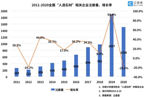 企查查数据显示,目前我国共注册“人造石材”相关企业9483家,其中状态为存续、在业的有7145家。2011-2019年,相关企业注册量呈上升趋势。其中2019年达到最高,该年共注册相关企业1897家,首次达到1000家以上,同比增长93.4%。