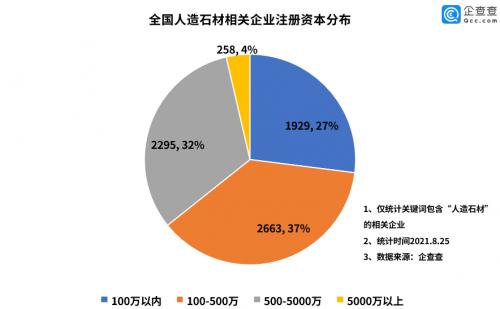 企查查数据显示,目前我国共注册“人造石材”相关企业9483家,其中状态为存续、在业的有7145家。2011-2019年,相关企业注册量呈上升趋势。其中2019年达到最高,该年共注册相关企业1897家,同比增长93.4%。广东、福建、山东分别是相关企业最多的三个省份。有64%的企业注册资本在500万以下。