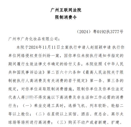 天眼查App显示,近日,广州市广舟化妆品有限公司及其法定代表人蒋某某和蒋某被广州互联网法院限制高消费,涉及与赵丽颖相关网络侵权责任纠纷案件。案例流程信息显示,不久前,该公司和蒋某已因此案被强制执行5万余元。