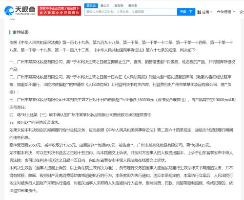 裁判文书信息显示,此前,该公司和某电商平台店铺的经营者高某某曾因侵犯赵丽颖肖像权、姓名权,被法院判决立即停止侵权行为并向赵丽颖公开赔礼道歉,同时该公司赔偿赵丽颖经济损失15万元,高某某就其中1万元承担连带责任,蒋某对广舟化妆品公司赔偿款项承担连带责任。风险信息显示,近日,广州市广舟化妆品有限公司因通过登记的住所或者经营场所无法联系,已被列入经营异常名录。