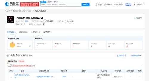 天眼查法律诉讼信息显示,近日,因未按执行通知书指定的期间履行生效法律文书确定的给付义务,上海爱洛星食品有限公司及其法定代表人被咸宁市咸安区人民法院限制高消费,涉及运输合同纠纷案件。案件流程信息显示,今年7月,该公司已因此案被强制执行21.74万余元。