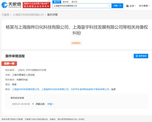 天眼查App显示,近日,杨紫与上海施桦日化科技有限公司、上海皇宇科技发展有限公司等肖像权纠纷案件新增开庭公告,原告为杨紫,该案将于2025年1月20日在上海市青浦区人民法院开庭审理。