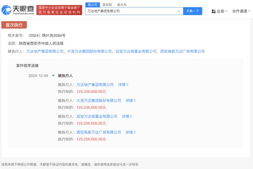 天眼查法律诉讼信息显示,12月4日,万达地产集团有限公司、大连万达集团股份有限公司、延安万达城置业有限公司等新增一则被执行人信息,执行标的1.2亿余元,涉及合同纠纷案件,执行法院为陕西省西安市中级人民法院。