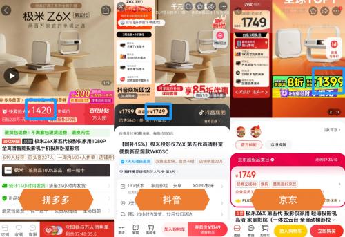 类似的还有极米Z6X第五代投影仪,在拼多多的到手价是1420元,在抖音的券后价是1749元,但在京东3C数码“疯狂星期一”可以叠加政府补贴,到手价低至1399元,比拼多多和抖音都更便宜。