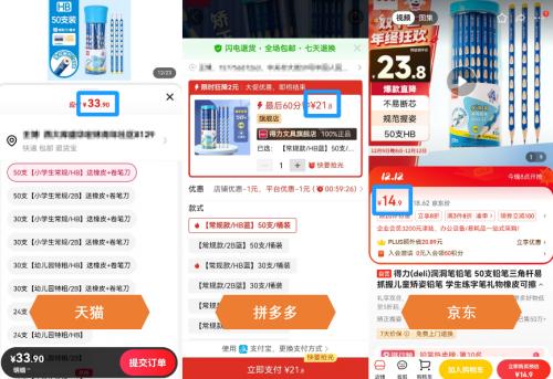 还有得力洞洞笔铅笔HB 50支装,在天猫的售价为33.9元,在拼多多的售价为21.8元,而在京东3C数码“疯狂星期一”的价格低至14.8元,还是京东更便宜。由此可见,消费者在下单前还是需要多比价,这样才能避免买贵。