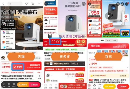 例如飞利浦NeoPix 345投影仪,这款产品在天猫和拼多多的售价都是1199元,但在京东3C数码“疯狂星期一”可以使用政府补贴享8折优惠,到手价低至959元,比天猫和拼多多便宜了240元。