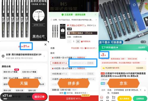 文具品类同样有差价的情况。同款的白雪H5直液式走珠笔6支,在天猫和拼多多都需要21.6元才能到手,但在京东3C数码“疯狂星期一”的价格仅为3.9元,比天猫和拼多多的2折价还低。