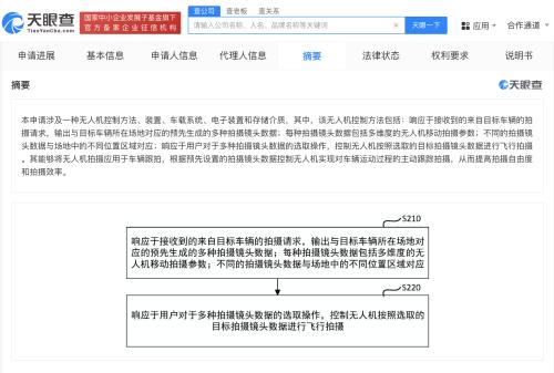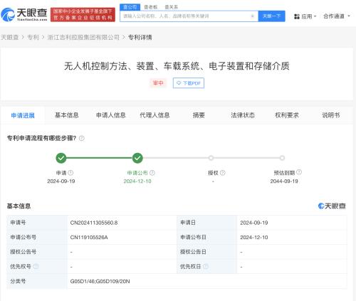 天眼查知识产权信息显示,近日,浙江吉利控股集团有限公司、浙江极氪智能科技有限公司申请的“无人机控制方法、装置、车载系统、电子装置和存储介质”专利公布。