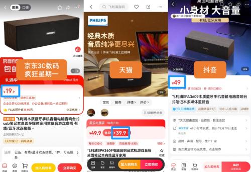 类似的还有飞利浦木质音箱,在京东3C数码“疯狂星期一”只需19.9元就能到手,但在天猫的售价却是39.9元,比京东贵了20元,相当于京东的两倍价;在抖音更是需要49元,比京东贵了29.1元。如果在下单前没有先比价,就要白白多花一笔冤枉钱出去了。