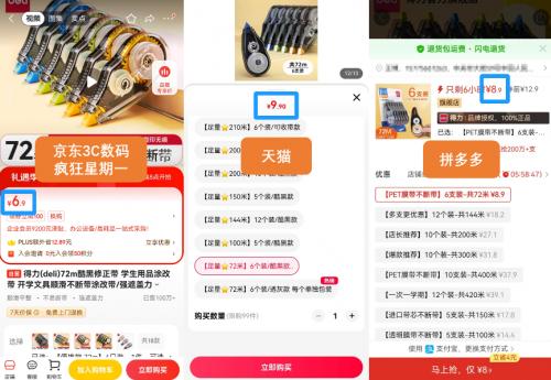 同样还有得力酷黑修正带6支装,在京东3C数码“疯狂星期一”的售价为6.9元,在天猫的到手价为9.9元,在拼多多则需要8.9元,都比京东更贵。所以大家无论是想下单什么样的产品,不论价格昂贵与否,都要记得在下单前多比价,只有经过对比才知道谁才是真正的低价。