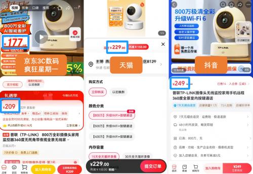 以TP-LINK 800万全彩摄像头为例,这款产品在京东3C数码“疯狂星期一”的售价为209元,而同款在天猫售价为229元,比京东贵20元;在抖音则为249元,比京东贵40元。并且在京东还可以使用国家补贴优惠15%,到手价进一步低至177.65元,另外两者则都不能使用国家补贴。