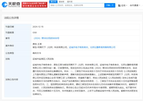 天眼查App显示,近日,运城市盐湖区人民法院向运城市电子商务商会公告送达民事判决书等,涉及原告王宝强与同骋天下(北京)科技有限公司、北京比鲁影视传媒有限公司及该商会人格权纠纷一案。公告显示,上述三被告被判向王宝强公开赔礼道歉,赔偿王宝强损失8万元,并交纳案件受理费2800元。