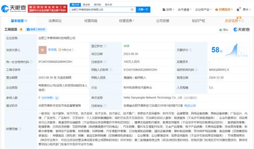 合肥三羊泰网络科技有限公司成立于2023年8月,注册资本100万人民币,经营范围含信息技术咨询服务、网络设备销售、个人互联网直播服务等,现由合肥泰燃科技有限公司全资持股。