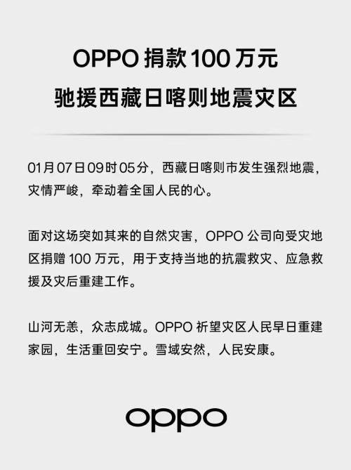 OPPO今日凌晨发文宣布,捐款100万元,用于支持西藏日喀则市抗震救灾及灾后重建工作。