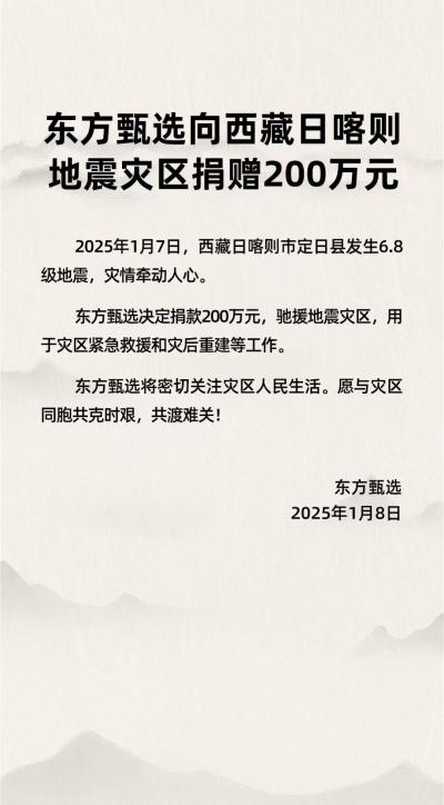 东方甄选向西藏日喀则地震灾区捐赠200万元。