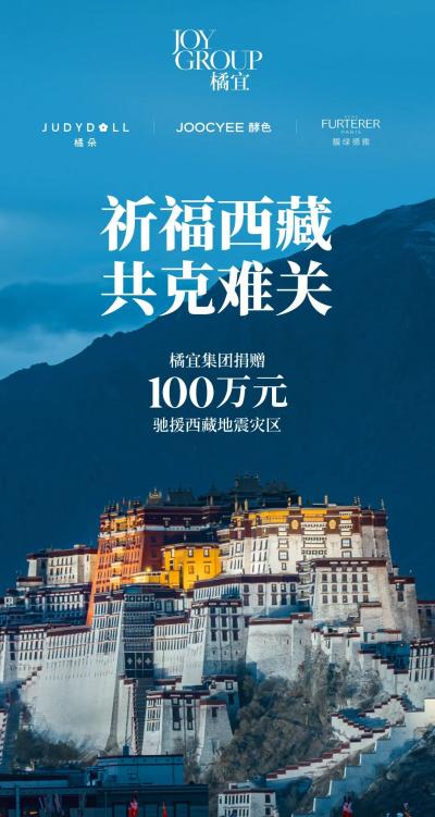 橘宜集团迅速行动,联合旗下品牌橘朵、酵色和馥绿德雅,携手中国乡村发展基金会向西藏受灾地区捐赠100万元人民币,驰援一线抗震救灾工作。