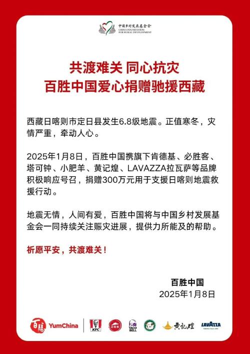 灾情发生后,百胜中国携旗下品牌肯德基、必胜客、TacoBell塔可钟、小肥羊、黄记煌、LAVAZZA拉瓦萨等积极响应号召,捐赠300万元用于支援日喀则地震救援行动。
