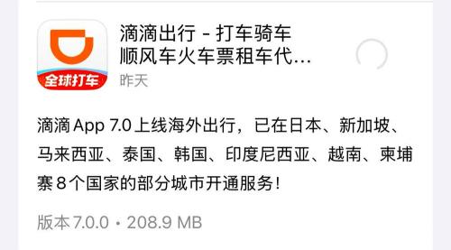 滴滴出行App已经在苹果App Store上线7.0版本。I从更新日志获悉,海外出行已在日本、新加坡、马来西亚、泰国、韩国、印度尼西亚、越南、柬埔寨8个国家的部分城市开通服务。