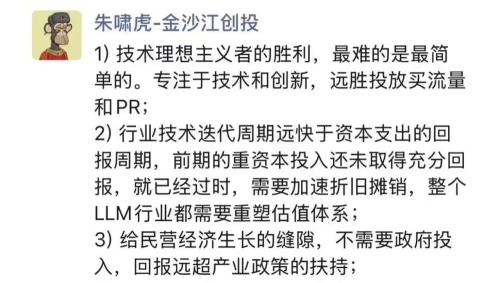 金沙江创投朱啸虎在朋友圈发文称“DeepSeek是技术理想主义者的胜利”。