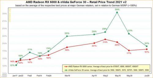 据3DCenter最新的统计,欧洲的英伟达RTX显卡价格大幅降低,由五月份的304%平均溢价降至了191%。