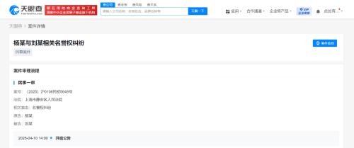 天眼查法律诉讼信息显示,近日,杨洋与刘某相关名誉权纠纷案件新增开庭公告,原告为杨洋,该案件将于4月10日在上海市静安区人民法院开庭审理。